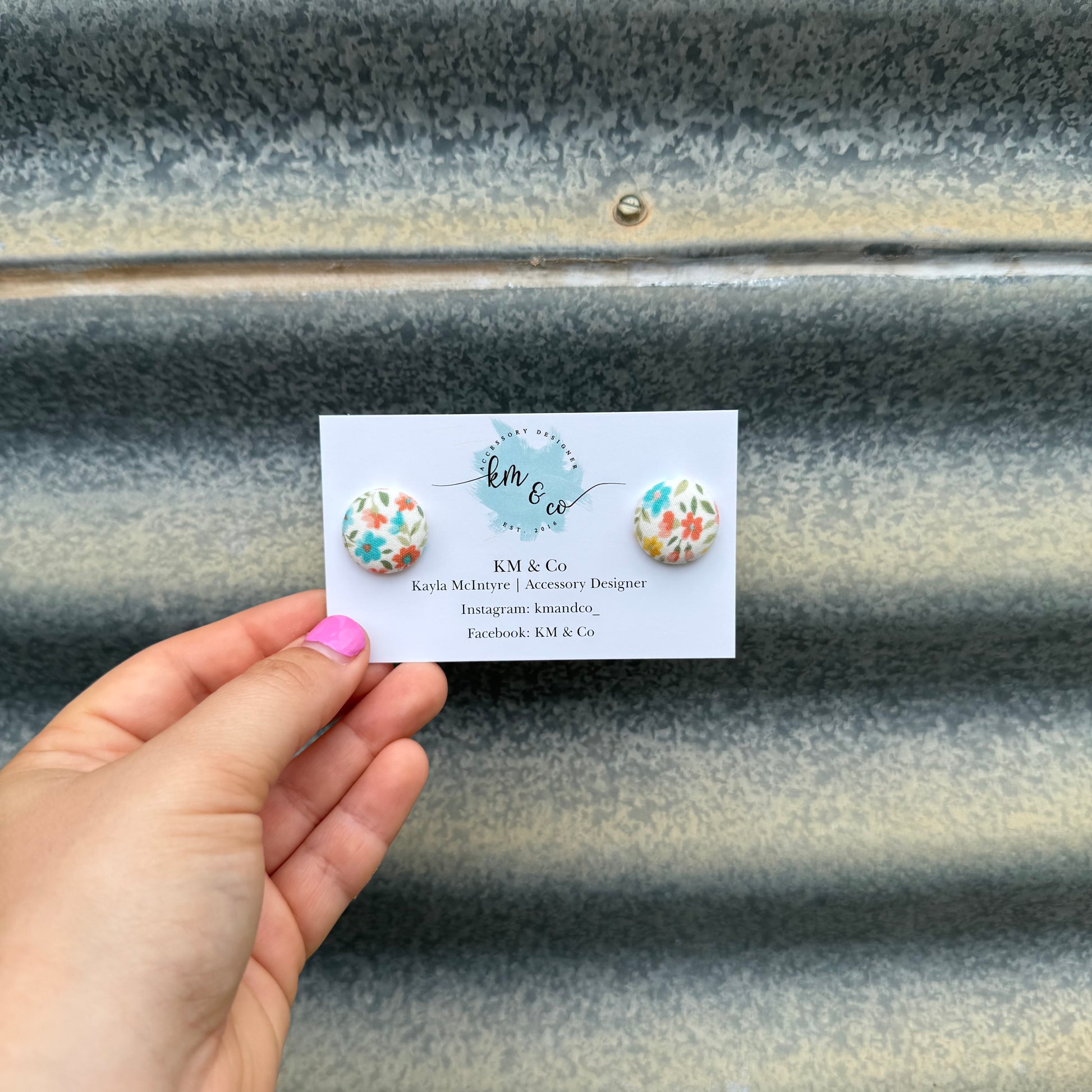 Our lightweight button earrings are the perfect everyday accessory — available in 15mm, 19mm & 23mm sizes to suit your style. Made with surgical steel posts for sensitive ears, they come in a wide range of colours and patterns, designed to complement any outfit.