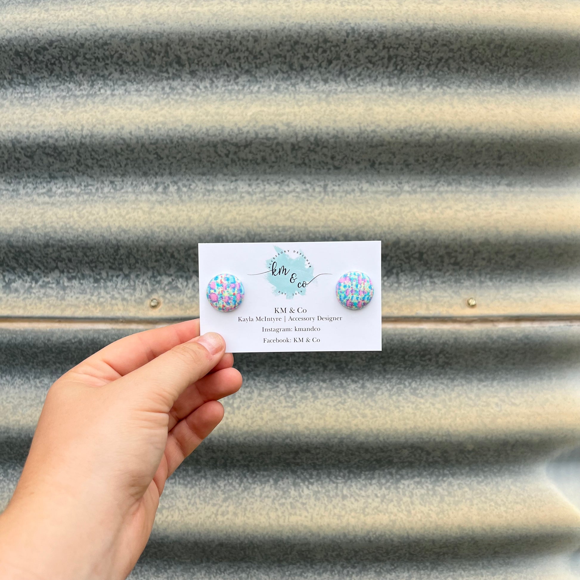 Our lightweight button earrings are the perfect everyday accessory — available in 15mm, 19mm & 23mm sizes to suit your style. Made with surgical steel posts for sensitive ears, they come in a wide range of colours and patterns, designed to complement any outfit.